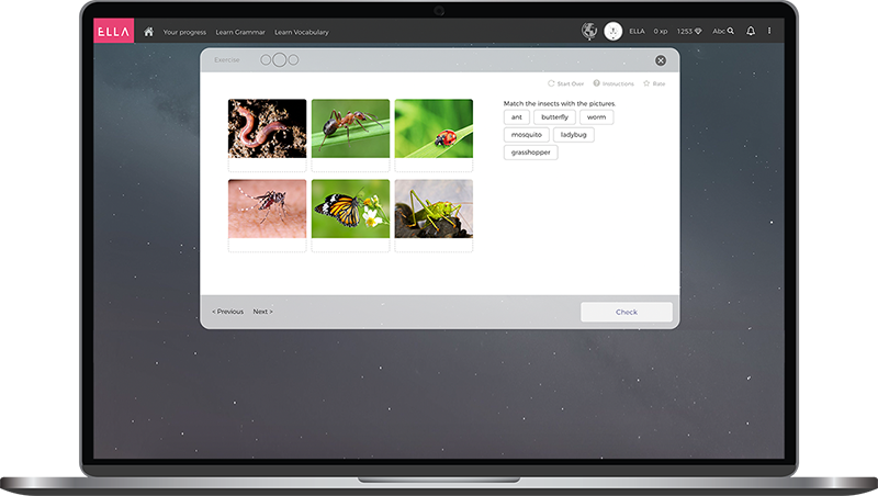 Mamy wiele rodzajów ćwiczeń, takich jak słuchanie, tworzenie zdań, przeciąganie i upuszczanie oraz wiele innych, które sprawiają że nauka będzie przyjemna!